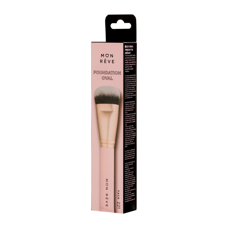 Mon Reve 221 Οβάλ Πινέλο Μεικάπ: Πλατύ, οβάλ πινέλο με πυκνές συνθετικές τρίχες. Ιδανικό για πούδρα, υγρό ή κρεμώδες foundation. Ακριβής, ομοιόμορφη & γρήγορη εφαρμογή.