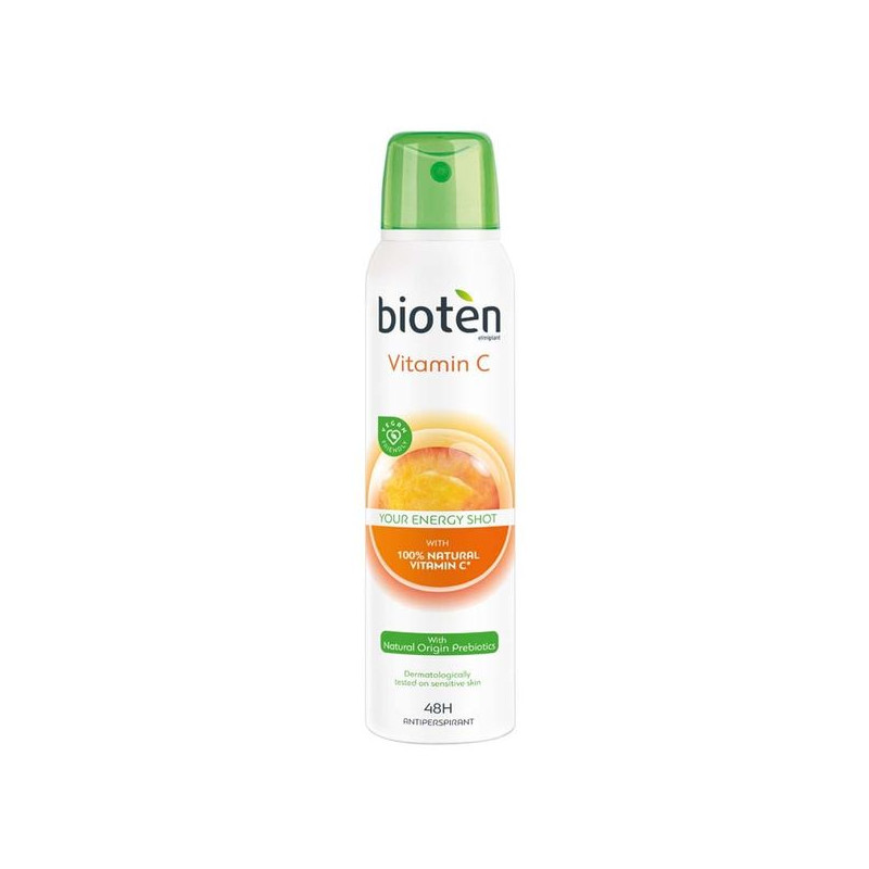 Το γυναικείο αντιιδρωτικό αποσμητικό Bioten Vitamin C spray περιέχει Βιταμίνη C που προέρχεται από 100% φυσικό εκχύλισμα του φυτού acerola το οποίο είναι πλούσια πηγή Βιταμίνης C! Επίσης, περιέχει πρεβιοτικά φυσικής προέλευσης που βοηθούν στην ενίσχυση της φυσικής άμυνας του δέρματος και περιορίζουν τα βακτήρια που προκαλούν την κακοσμία στην περιοχή της μασχάλης. Προσφέρει μοναδικό άρωμα εσπεριδοειδών που συναρπάζει κάθε γυναίκα! Με 48ωρη προστασία από τον ιδρώτα και την κακοσμία, είναι Vegan Friendy, δερματολογικά ελεγμένο σε ευαίσθητη επιδερμίδα και δεν περιέχει οινόπνευμα.