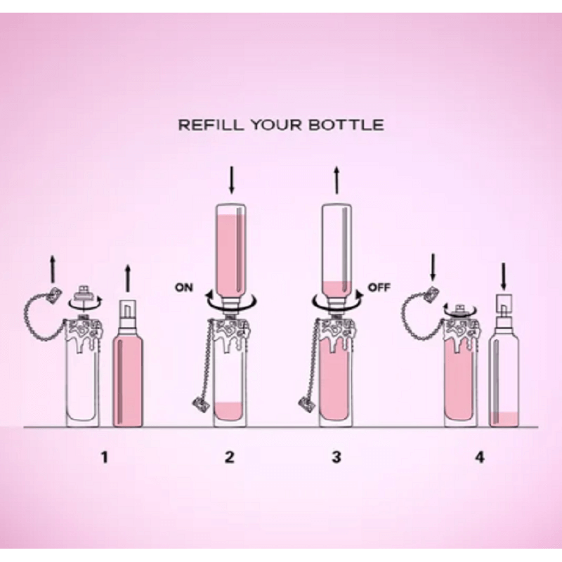 Αφαιρέστε προσεκτικά το καπάκι και ξεβιδώστε την αντλία από το άρωμά σας. Τοποθετήστε την άκρη του δοχείου αναπλήρωσης στην οπή και βιδώστε απαλά. Περιμένετε μέχρι να σταματήσει αυτόματα η αναπλήρωση και, στη συνέχεια, ξεβιδώστε. Ξαναβιδώστε την αντλία και το καπάκι.