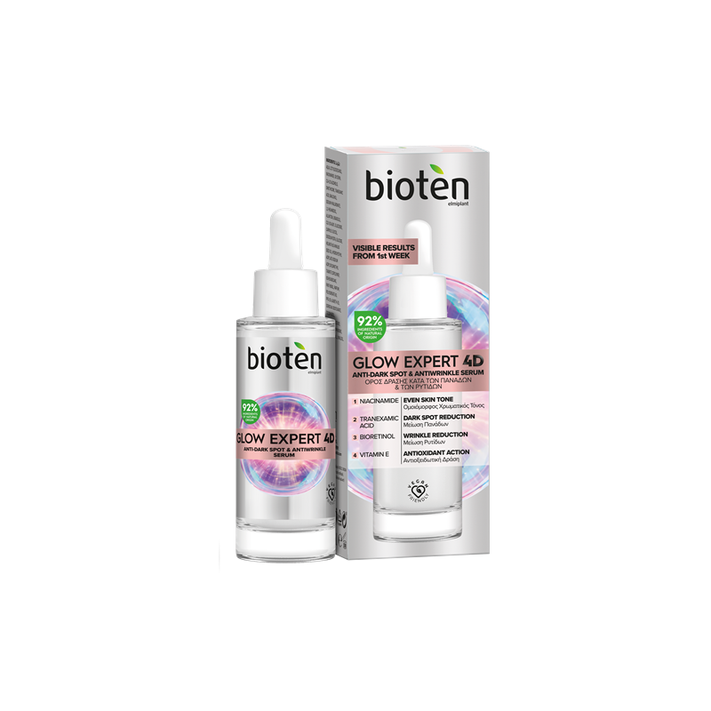Ο συμπυκνωμένος ορός bioten GLOW EXPERT 4D με 92% συστατικά φυσικής προέλευσης, δρα αποτελεσματικά ενάντια στις πανάδες και στις ρυτίδες προσφέροντας λάμψη που διαρκεί.