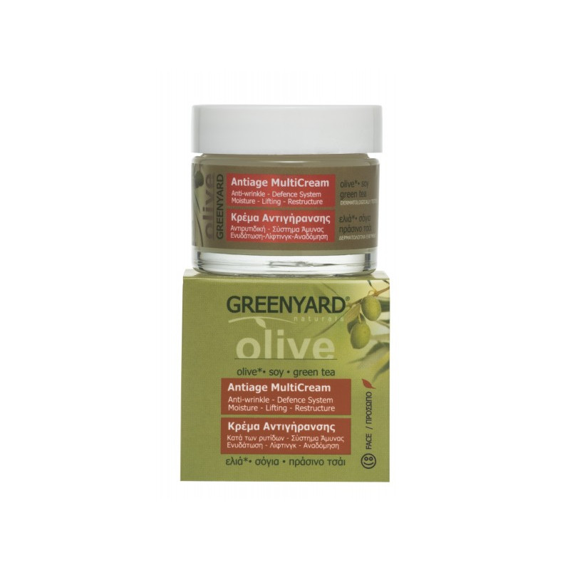 Η Greenyard Antiage MultiCream 50ml είναι μια μη λιπαρή κρέμα προσώπου πολλαπλής δράσης, εμπλουτισμένη με Ελιά, Πράσινο Τσάι και Σόγια. Καταπολεμά τις ρυτίδες, αναδομεί, συσφίγγει και ενυδατώνει την επιδερμίδα, χαρίζοντας λάμψη και νεανική όψη.